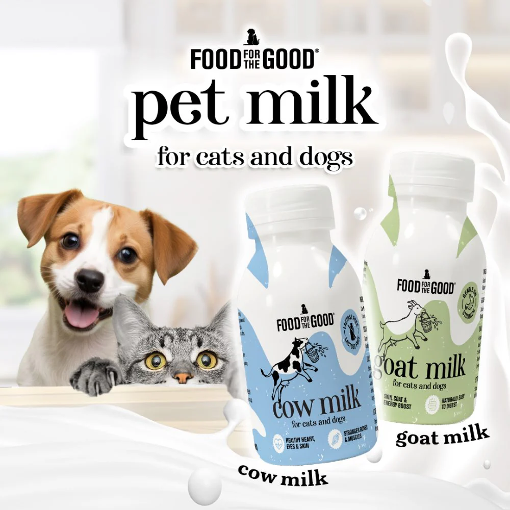 Food For The Good Cow & Goat Milk is the tummy loving, good vibes sip for sensitive pets – easy to digest, packed with vitamins E for energy and glow, boosting hydration and keeping their coats shining.